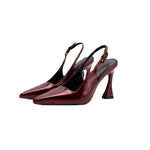 Diese hochwertigen Lackleder-Pumps in glänzendem Bordeaux-Rot sind ein echter Blickfang! Das spitz zulaufende Design verleiht eine edle Note, während der geschwungene Absatz für einen modernen, femininen Look sorgt. Dank des verstellbaren Slingback-Riemchens bieten sie einen sicheren und bequemen Halt – perfekt für stilvolle Auftritte.