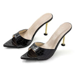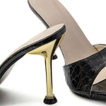 Die Isabelle Luxe Black Croc-Embossed Mule Heels vereinen Eleganz, Stil und Komfort in einem atemberaubenden Design. Mit einer hochwertigen Krokodilprägung, einer spitzen offenen Zehenpartie und einem goldenen Stiletto-Absatz sind diese Schuhe die perfekte Wahl für besondere Anlässe oder einen stilvollen Alltagslook.