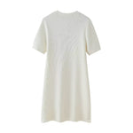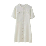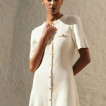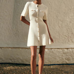 Minimalismus trifft auf französischen Chic: Dieses elegante Minikleid besticht durch seine klare Linienführung, die edle Knopfleiste und die strukturierte Textur. Die kurzen Ärmel und der leicht ausgestellte Schnitt sorgen für eine klassische, feminine Silhouette, während die Zierleisten an Brust und Knopfleiste dem Kleid eine stilvolle Note verleihen.