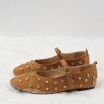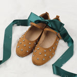 Diese edlen Ballerinas aus Veloursleder in warmem Cognac-Ton vereinen Komfort und Eleganz. Die glitzernden Strasssteine setzen funkelnde Akzente, während der feine Riemen mit Schnalle für einen sicheren Sitz sorgt. Die flache Sohle macht sie zum perfekten Begleiter für den Alltag oder besondere Anlässe.