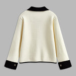 Verleihen Sie Ihrem Stil mit dieser schicken weißen Cardiganjacke einen Hauch von Eleganz. Sie besticht durch den raffinierten schwarzen Kontrastbesatz, einen klassischen Kragen und stilvolle Knopfdetails. Mit zwei Fronttaschen und modischen Manschetten ist dieses vielseitige Stück die perfekte Wahl für sowohl legere als auch formelle Looks und ein unverzichtbares Must-have für alle Jahreszeiten.