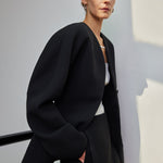 Entdecken Sie diesen eleganten schwarzen Blazer, der Ihre Garderobe mit seinem modernen minimalistischen Design aufwertet. Der taillierte Blazer verfügt über asymmetrische Knopfdetails, die dem klassischen Schnitt eine einzigartige Note verleihen. Perfekt für berufliche Anlässe, Abendveranstaltungen oder stilvolle Alltagslooks, bietet dieser Blazer Vielseitigkeit und zeitlose Eleganz. Shoppen Sie jetzt dieses unverzichtbare Kleidungsstück, das moderne Designs mit raffiniertem Stil vereint.
