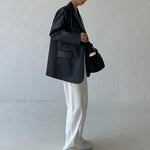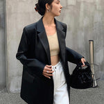 Entdecken Sie den stylischen oversized schwarzen Blazer für Damen, der sowohl Eleganz als auch Komfort in Ihre Garderobe bringt. Dieser schicke Blazer wird mühelos mit einem neutralen Crop-Top und weißen Hosen kombiniert, was ein modernes, smart-casual Outfit ergibt. Ideal für verschiedene Anlässe, lässt sich dieses vielseitige Outfit problemlos vom Büro zu Abendessen oder legeren Ausflügen tragen. Mit seinem zeitlosen Design und schmeichelhaften Schnitt ist dieser schwarze Blazer ein Must-have für jede modebewusste Frau, die sowohl Eleganz als auch Praktikabilität sucht.