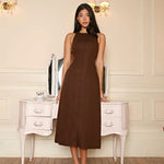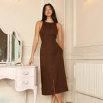 Crystal | Ärmelloses Zuknöpfen Braun Leinen Midikleid mit figurbetonter Passform