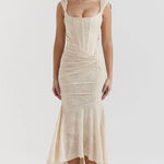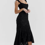 Dieses atemberaubende, schulterfreie Abendkleid ist die perfekte Wahl für elegante Auftritte bei Hochzeiten, Gala-Events oder romantischen Abenden. Das Kleid vereint feminine Eleganz mit einem Hauch Sinnlichkeit und ist aus hochwertiger Spitze gefertigt, die sich angenehm an die Haut anschmiegt. Die taillierte Silhouette betont die weiblichen Kurven, während der asymmetrische Saum dem Design eine moderne Raffinesse verleiht. Die feinen Drapierungen an der Taille sorgen für eine schmeichelhafte Form und setzen stilvolle Akzente. Das Kleid wird ohne Träger getragen, wodurch Schultern und Dekolleté wunderschön in Szene gesetzt werden. Es ist ideal für Frauen, die ein Statement setzen und sich in ihrer Haut rundum wohlfühlen möchten.
