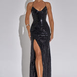 Das Dyonne Kleid ist gemacht für große Auftritte und unvergessliche Nächte. Vollständig mit schwarzen, lichtreflektierenden Pailletten besetzt, zieht dieses Abendkleid alle Blicke auf sich. Die feinen Spaghettiträger, der feminine V-Ausschnitt und der taillierte Schnitt sorgen für eine sinnliche Silhouette, die durch den hohen Beinschlitz zusätzlich betont wird.