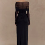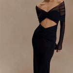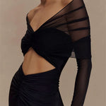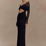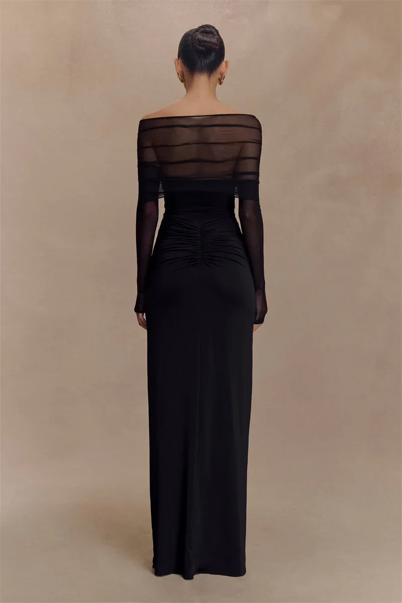 Dieses sinnliche Maxikleid ist ein echter Blickfang für stilvolle Events. Mit seinem raffiniert gerafften Cut-Out im Bauchbereich und dem schulterfreien Design betont es auf elegante Weise die femininen Konturen. Die transparenten, langen Ärmel aus feinem Mesh verleihen dem Look einen modernen Hauch von Leichtigkeit.