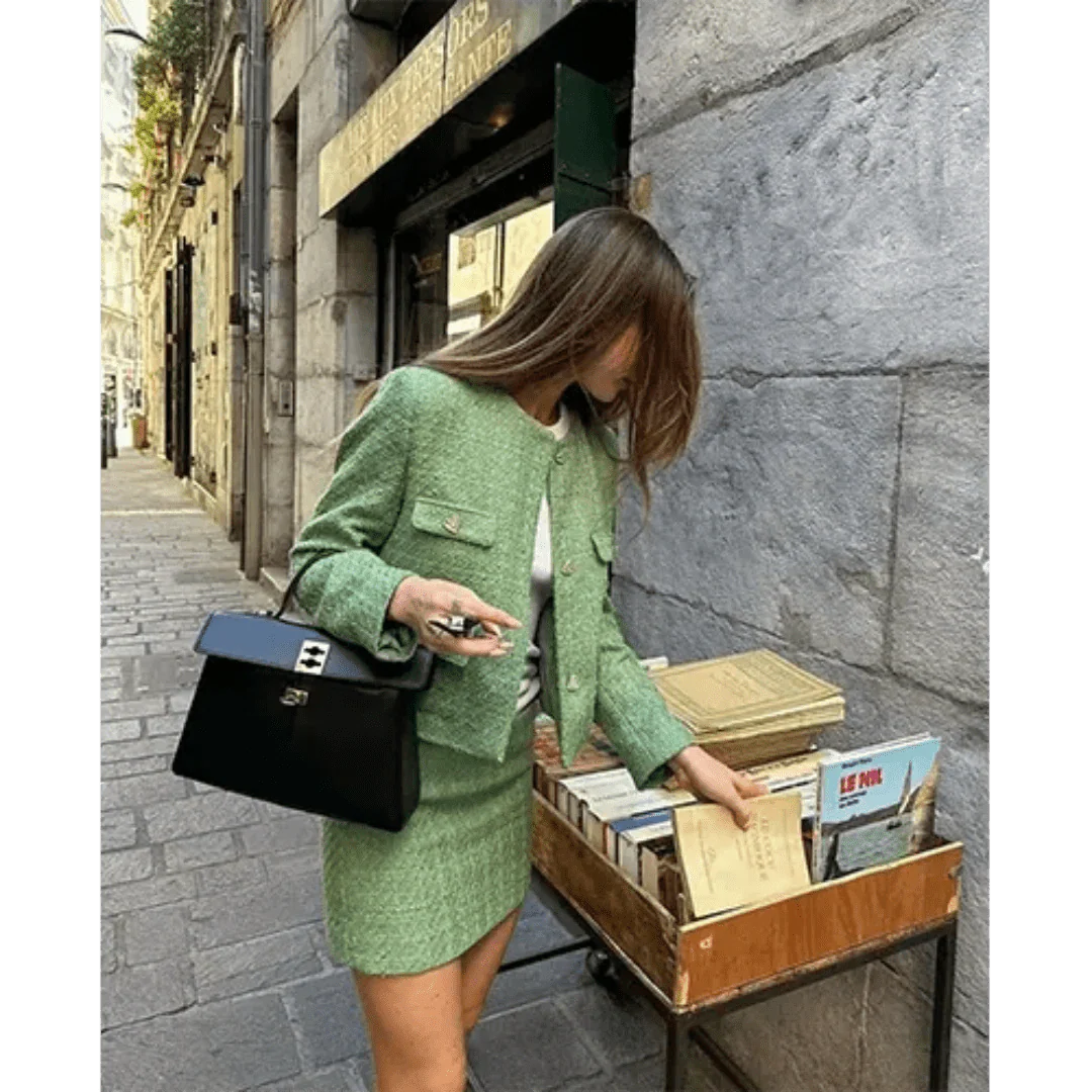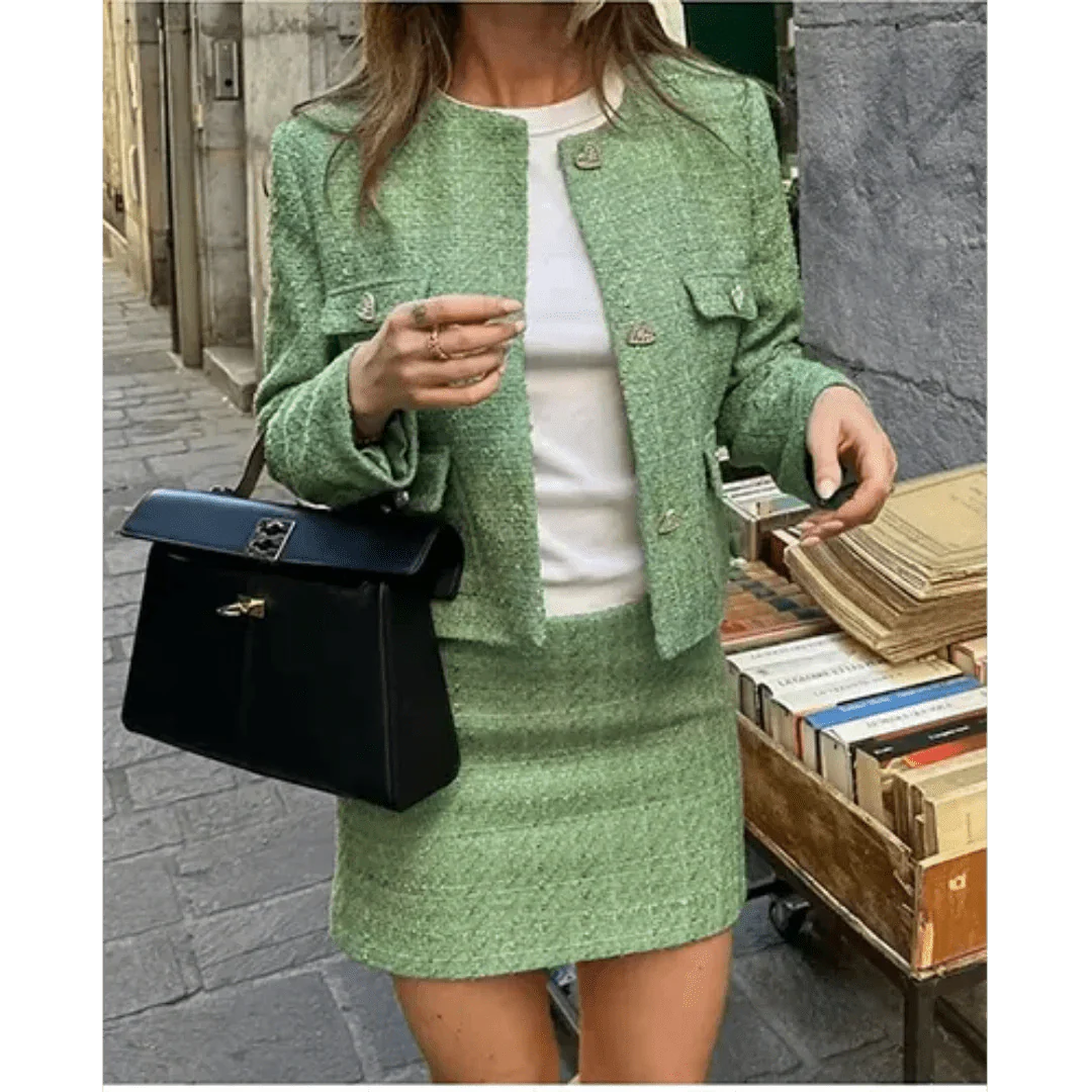 Ein Tweed-Zweiteiler, der Eleganz und femininen Chic vereint – das perfekte Outfit für stilbewusste Frauen.