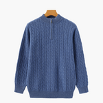 • Blauer Zopfmuster-Pullover mit Zipper – Klassisch, wärmend & zeitlos.