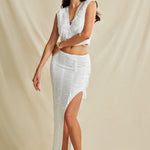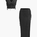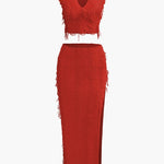 Der Charlene Fransen-Zweiteiler ist ein atemberaubendes Ensemble, das Stil und Dynamik vereint. Das ärmellose Top mit V-Ausschnitt sorgt für eine feminine Note, während der figurbetonte Rock mit seitlichem Schlitz und langen Fransen eine elegante Bewegung verleiht. Perfekt für besondere Anlässe, Partys oder sommerliche Abendveranstaltungen.