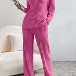 Dieses gemütliche Strick Set vereint Komfort und zeitlosen Stil. Mit seinem femininen V-Ausschnitt und dem lockeren Schnitt sorgt das Oberteil für ein entspanntes Tragegefühl, während die weite Hose Bewegungsfreiheit und Eleganz bietet. Das gerippte Strickmuster verleiht dem Set eine moderne Note und macht es zu einem idealen Outfit für entspannte Tage zuhause oder stilvolle Freizeitmomente. Ein vielseitiger Zweiteiler, der sowohl Komfort als auch Klasse ausstrahlt.