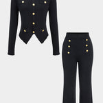 Das Diana Zweiteiler-Set kombiniert luxuriösen Strick mit zeitloser Eleganz. Die taillierte Strickjacke mit dekorativen Goldknöpfen und stilvollen Taschen verleiht dem Look eine edle Note, während die Wide-Leg-Hose mit hoher Taille für eine schmeichelhafte Silhouette sorgt. Die gerippte Strickstruktur betont die Figur und macht das Set sowohl elegant als auch komfortabel – ideal für schicke Business-Looks, stilvolle Abendveranstaltungen oder gehobene Freizeit-Outfits.