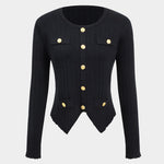 1. Taillierte Strickjacke mit Goldknöpfen – Femininer Schnitt mit luxuriösen Details.