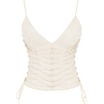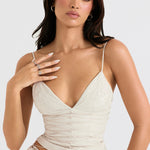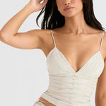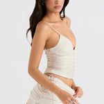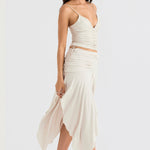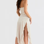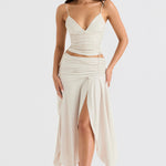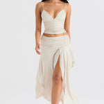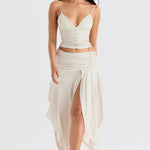 Heben Sie Ihren Stil mit diesem eleganten und raffinierten beigefarbenen Outfit hervor, mit dem Sie ein Statement setzen. Mit einem gerüschten Spaghettiträger-Top und einem hochgeschlitzten Maxirock ist dieses Ensemble perfekt für jeden besonderen Anlass. Ob es sich um eine formelle Veranstaltung, eine Hochzeit oder einen romantischen Sommerabend handelt, dieses Outfit sorgt dafür, dass Sie mühelos schick und stilvoll aussehen.