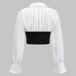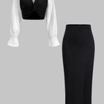 Das Martina Zweiteiler-Set kombiniert feminine Eleganz mit modernen Akzenten. Die stilvolle Bluse im Two-in-One-Look vereint den klassischen Chic einer weißen Hemdbluse mit dem verführerischen Charme eines integrierten Corsagen-Tops. Die ausgestellten Ärmel mit Manschetten verleihen dem Look eine raffinierte Note. Der figurbetonte Bleistiftrock mit hoher Taille sorgt für eine schlanke Silhouette und betont die weiblichen Kurven auf elegante Weise.