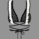 Das Sandy Strick-Zweiteiler-Set verbindet sommerliche Eleganz mit verspieltem Retro-Charme. Das gehäkelte Bikini-Oberteil mit Wickelband betont deine Figur, während der mehrstufige Rüschenrock in Schwarz-Weiß für eine feminine Silhouette sorgt. Ein stylisches Set für Urlaub, Festivals oder warme Sommertage!