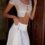 Das Serena Zweiteiler-Set vereint romantische Spitze mit fließender Eleganz. Das zarte Spitzen-Crop-Top mit verspielter Schnürung trifft auf einen asymmetrischen Midi-Rock, der eine feminine und elegante Silhouette schafft. Perfekt für sommerliche Dates, elegante Tagesoutfits oder besondere Anlässe, ist dieses Set ein absolutes Must-have für stilbewusste Frauen.