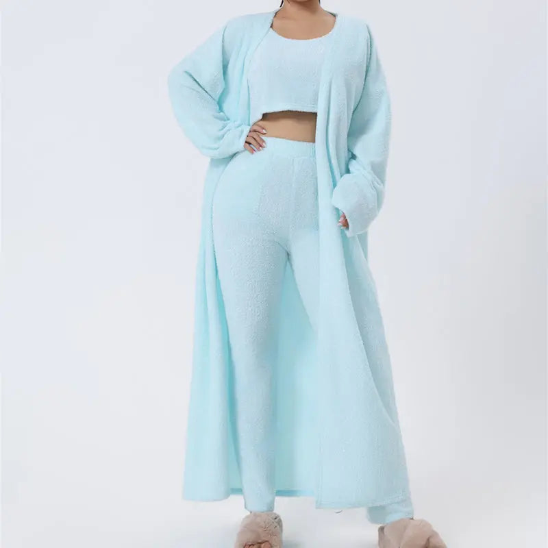 Entfliehen Sie in eine Welt des ultimativen Komforts und werden Sie zur Königin Ihrer Lounge mit diesem weichen und flauschigen 3-teiligen Set! Lassen Sie sich vom Luxus des tiefen Ausschnitts vorne und hinten am Crop-Top einhüllen, das mit schmalen Trägern für einen Hauch von Raffinesse sorgt.