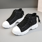 Diese trendigen Damen-Sneaker in Jeansblau vereinen sportlichen Stil mit einem Hauch von Street-Fashion. Die High-Top-Sneaker bestehen aus robustem Canvas-Material mit einer auffälligen weißen Gummisohle. Der seitliche Reißverschluss mit kleinen Anhängern verleiht dem Schuh einen verspielten und modernen Look.