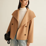 • Elegante Details: Eine doppelte Knopfleiste und ein großer, offener Kragen verleihen dem Mantel eine besondere Note.