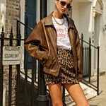 Der Luna Look vereint edgy Streetstyle mit femininer Raffinesse. Die oversized Lederjacke in Vintage-Optik sorgt für eine lässige Coolness, während das bedruckte Statement-Shirt einen urbanen Touch hinzufügt. Der figurbetonte Minirock mit Leopardenmuster bringt das Outfit auf das nächste Level und macht es perfekt für stylishe City-Trips, Kaffeedates oder ein Fashion-Statement auf der Straße.
