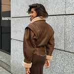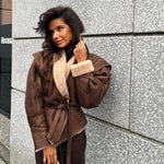 Diese modische Kunstlederjacke in einem warmen Braunton kombiniert Funktionalität und Stil. Mit ihrem weichen Teddy-Futter, den auffälligen Schnürdetails und dem Taillengürtel ist sie perfekt für kühle Tage geeignet. Der einzigartige Schnitt verleiht jedem Outfit eine moderne Note.